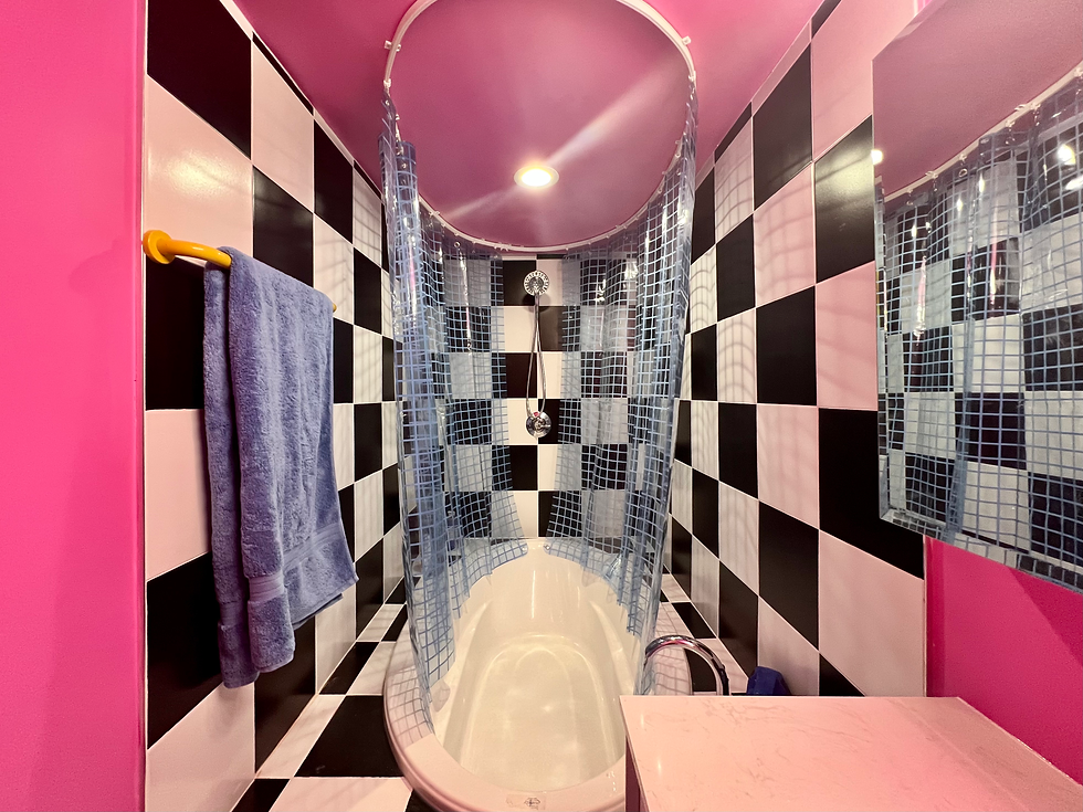 Our most unique project to date. We gave the bathroom a full renovation with vibrant pink walls, classic checkerboard tile, new hardware and a double vanity. We also installed brand new flooring, updated the drywall, and gave the garage a bold, vibrant finish.