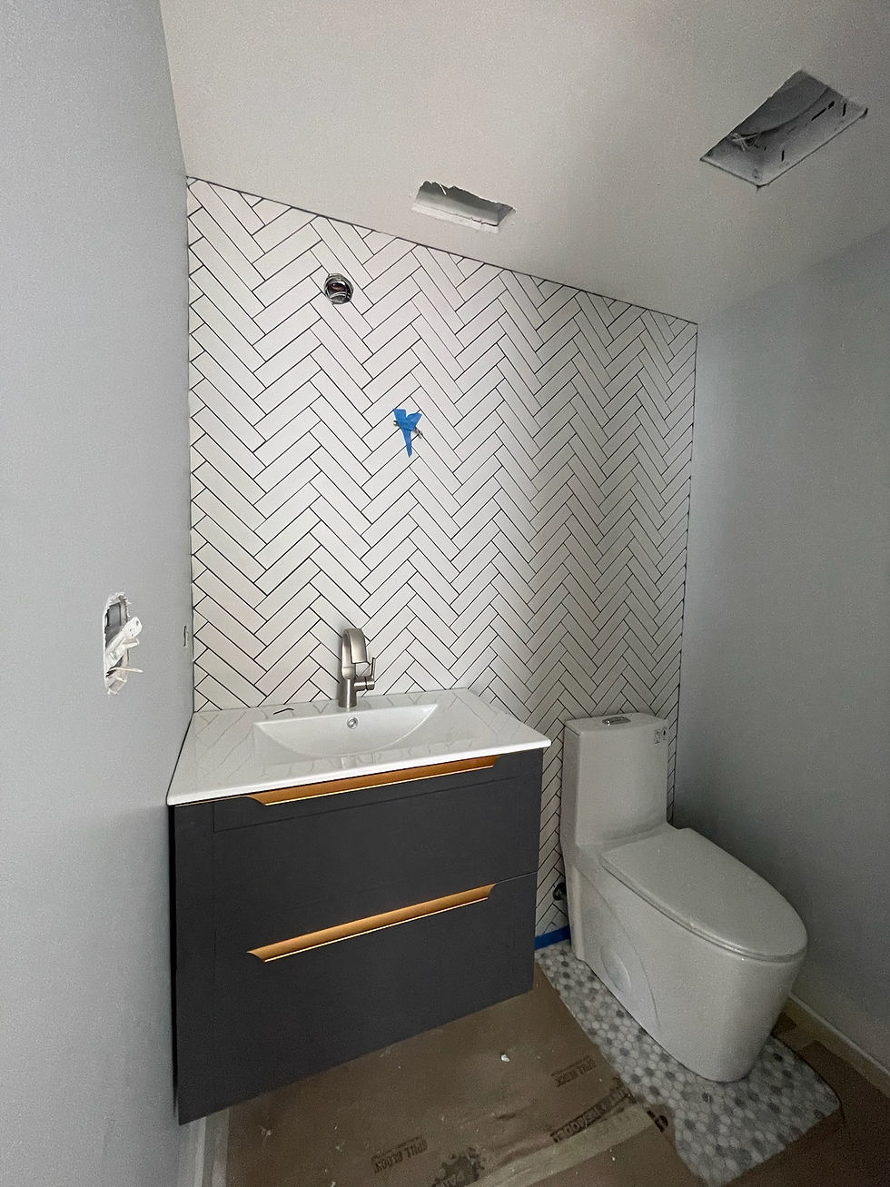 This project is almost completed! All we have left to do is install the remaining light fixtures, install the kitchen backsplash and bathroom hardware. Click below for more information and keep an eye out for the final reveal coming soon!